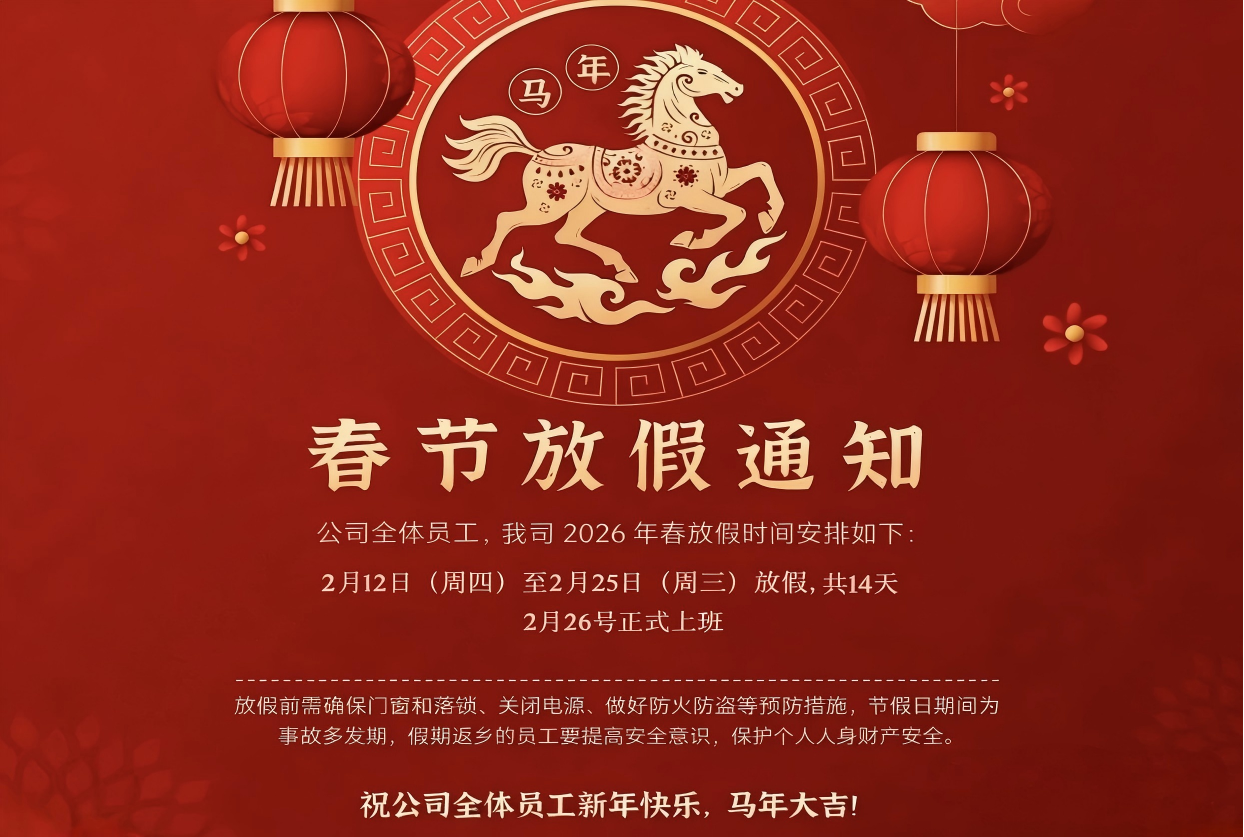 为确保春节期间的业务衔接顺畅,特此告知:我司将于 2026.2.12 --2026.2.25放假,2026.2.26正式恢复正常运营。放假期间,我们将暂停日常订单处理与发货服务,若有紧急业务咨询或需求,可直接联系0086-574-62550081。